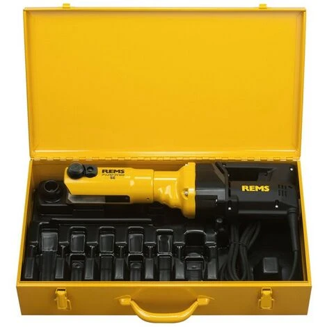 Power-Press SE Rems Radialpresse elektr. Basic-Pack Elektrische Radialpresse zur Herstellung von Pressverbindungen Dm. 10 – 108 (110) mm, Dm. 3/8″ – 4″. Zum Antrieb von REMS Presszangen/Pressringen und von geeigneten Presszangen/Pressringen anderer Fabrikate. Presszangenaufnahme mit automatischer Verriegelung. Elektromechanischer Antrieb mit bewährtem Universalmotor 230 V, 50 – 60 Hz, 450 W, wartungsfreiem Getriebe mit Sicherheits-Rutschkupplung und Vorschubsystem mit Trapezgewindespindel, Überlastschutz, Sicherheits-Tippschalter. Im stabilen Stahlblechkasten.