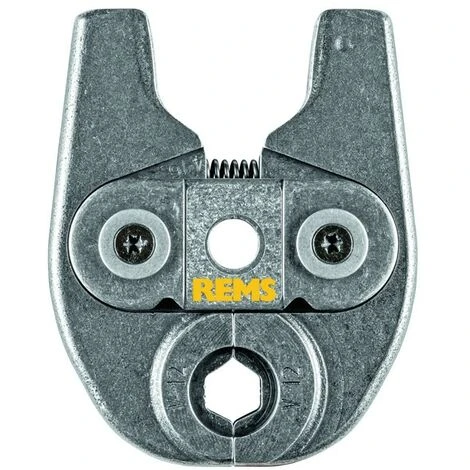 Rems Presszange Mini V12 f. metallene Viega Presssysteme REMS Presszange Mini mit 2 schwenkbaren Monoblock-Pressbacken. Besonders kompakte Bauform und geringes Gewicht der REMS Presszangen Mini durch spezielle Anordnung des Presszangenanschlusses (Patent EP 1 952 948). In die Pressbacken eingelassene Vertiefungen zur sicheren Führung der Verbindungslaschen für versatzfreies Pressen (Patent EP 2 347 862).